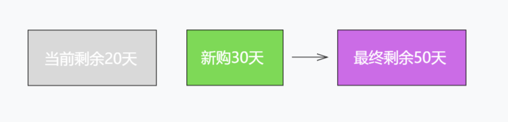 当前流量包还剩 20 天有效期,现在购买一个 30 天的流量包 → 流量叠加、有效期延长 30 天,总共 50 天。